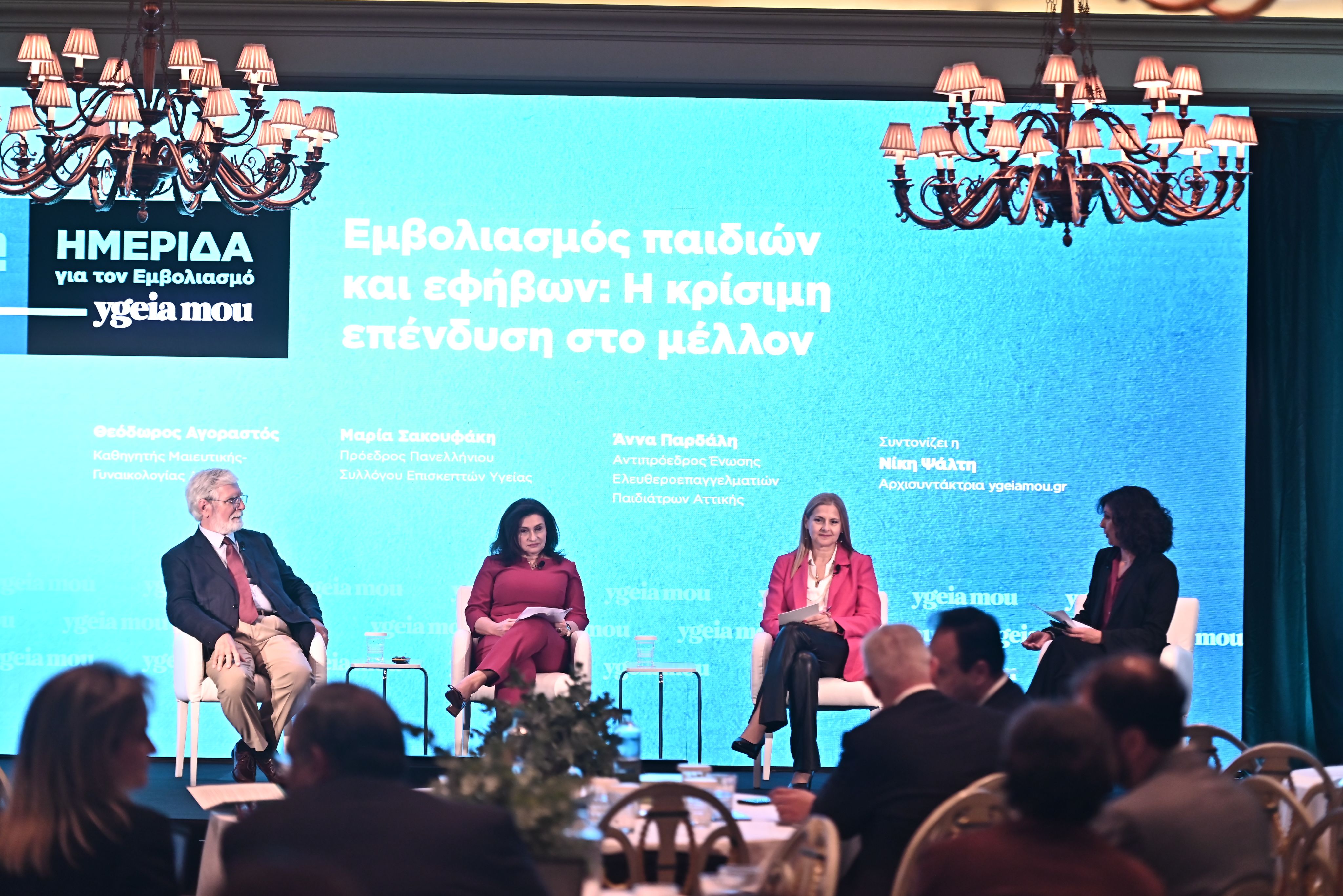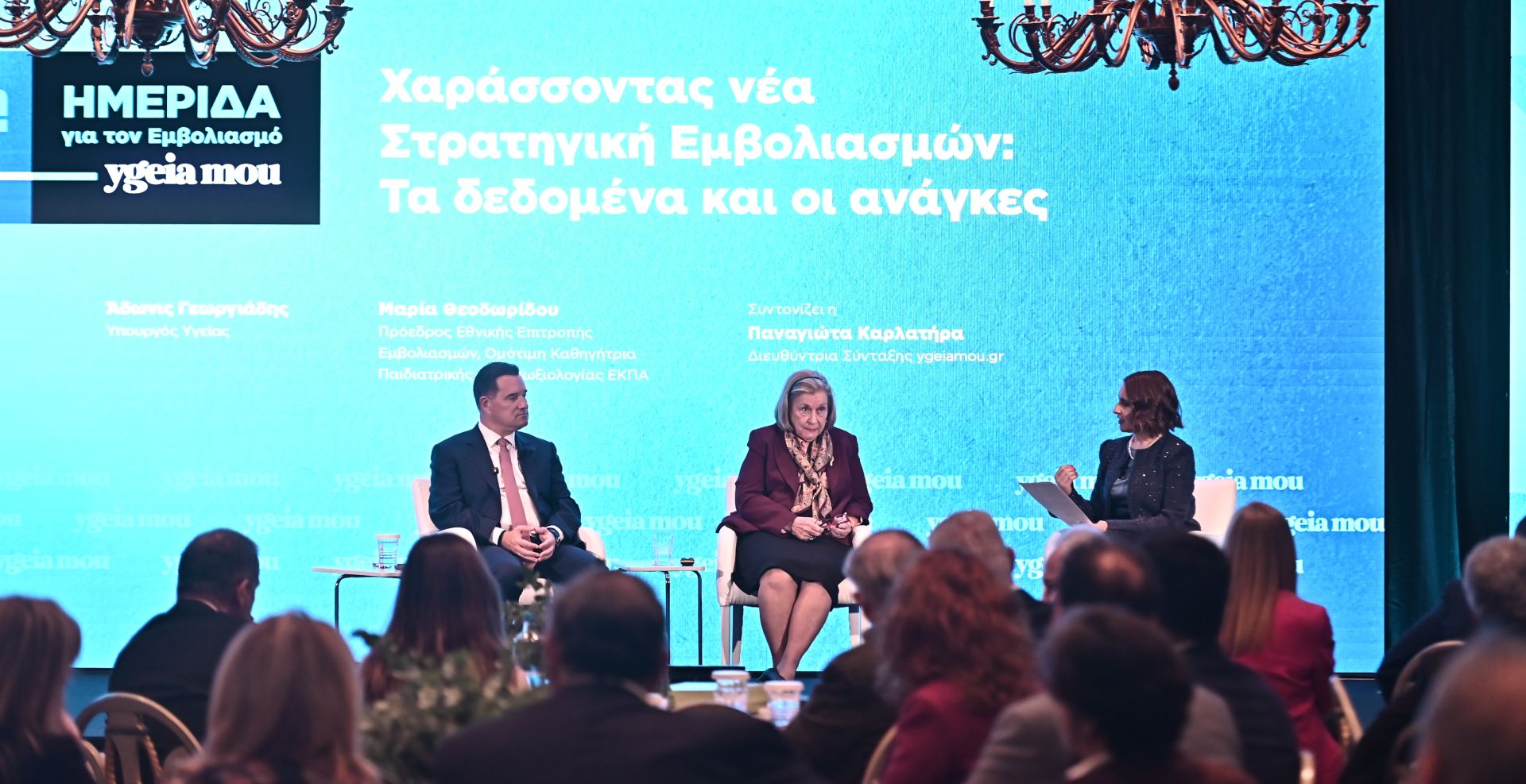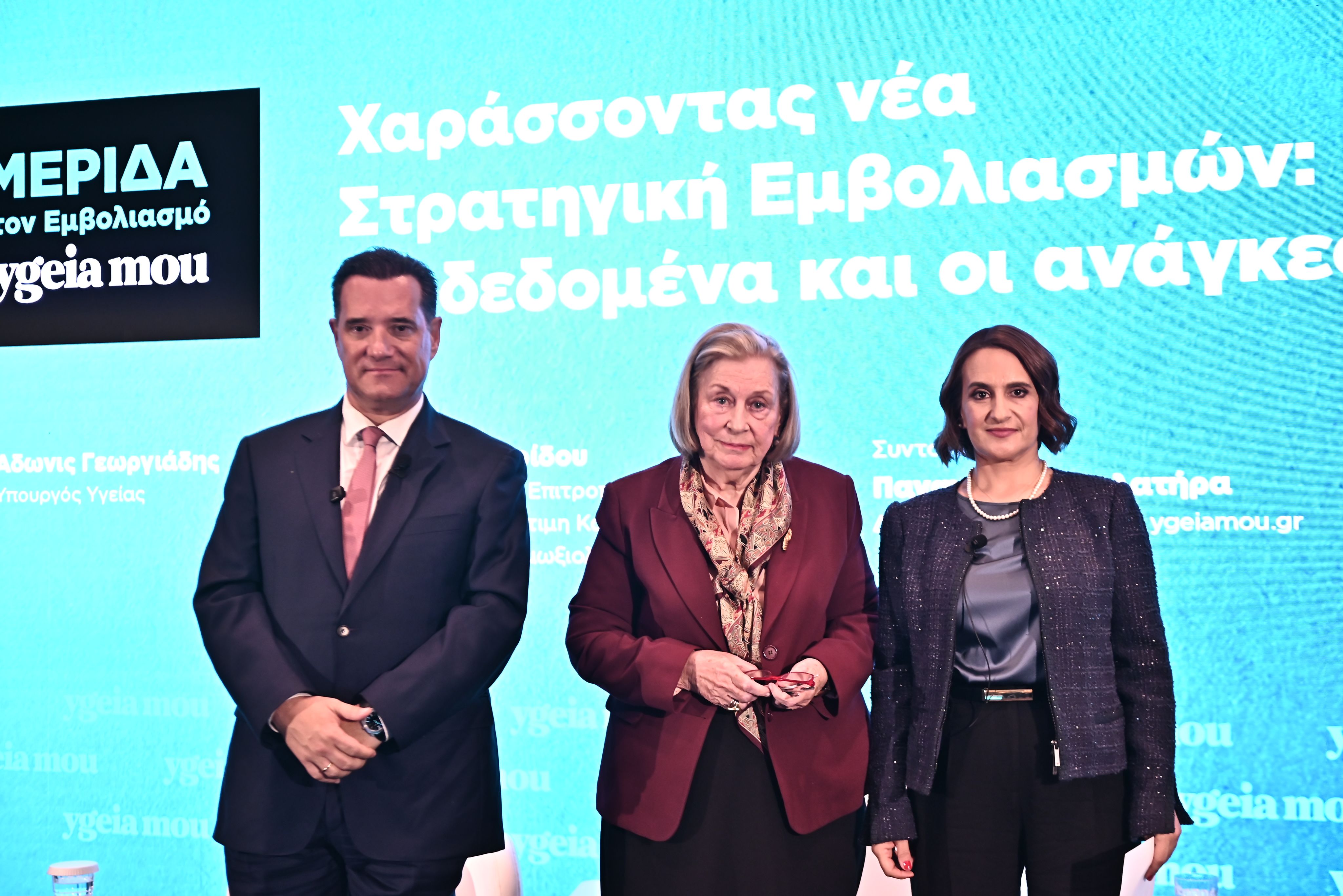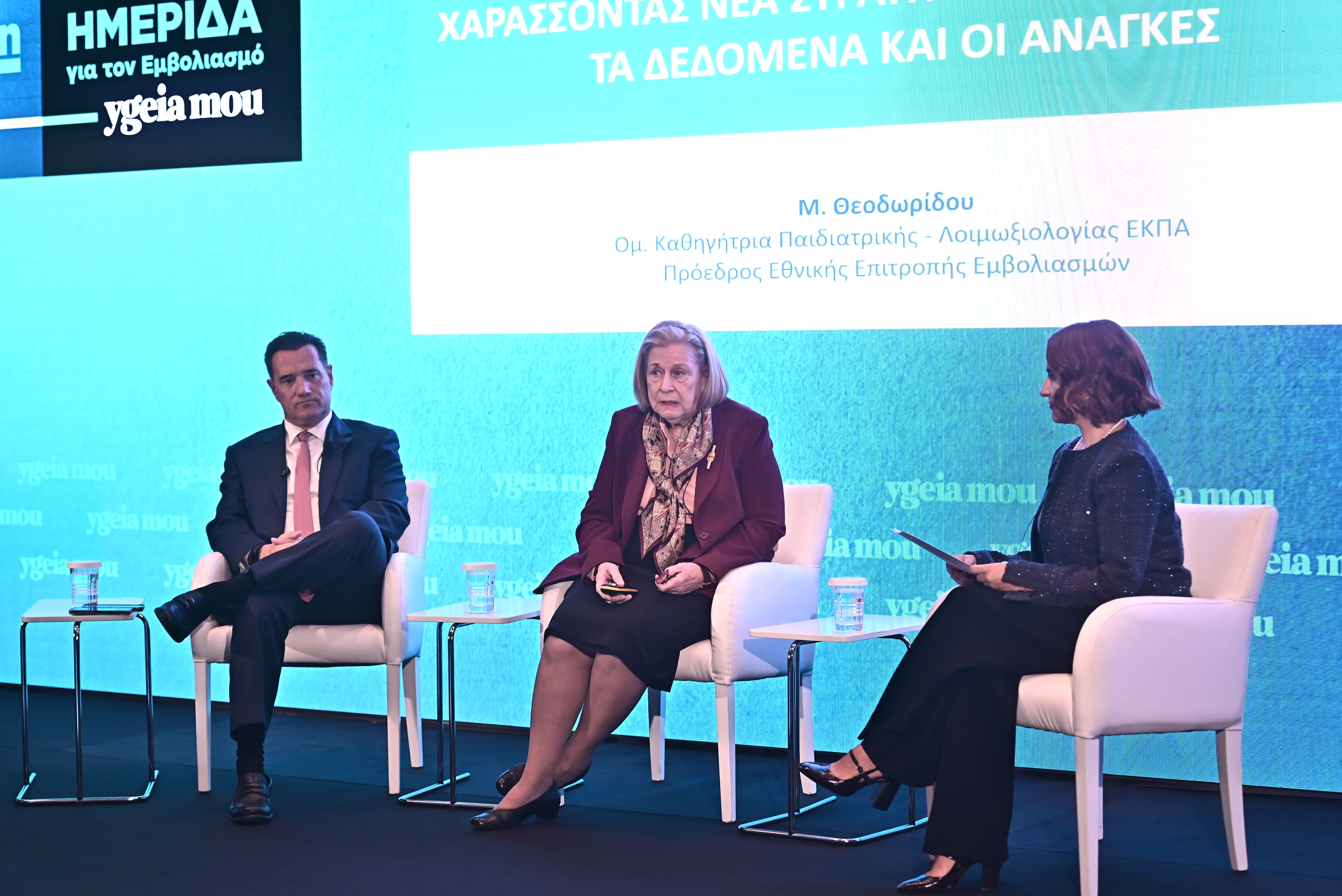 Άδωνις Γεωργιάδης, Υπουργός Υγείας, Μαρία Θεοδωρίδου, Πρόεδρος Εθνικής Επιτροπής Εμβολιασμών, ομότιμη Καθηγήτρια Παιδιατρικής – Λοιμωξιολογίας ΕΚΠΑ, Παναγιώτα Καρλατήρα, Διευθύντρια Σύνταξης ygeiamou.gr